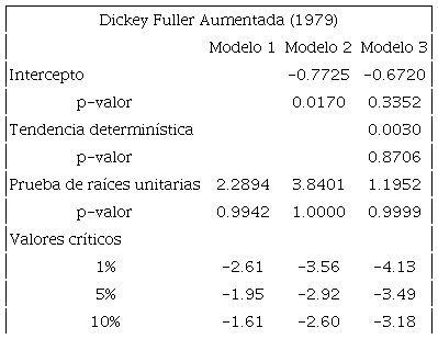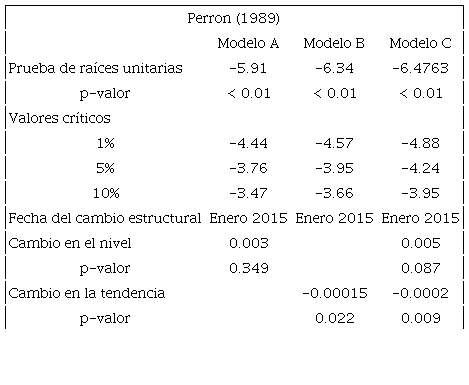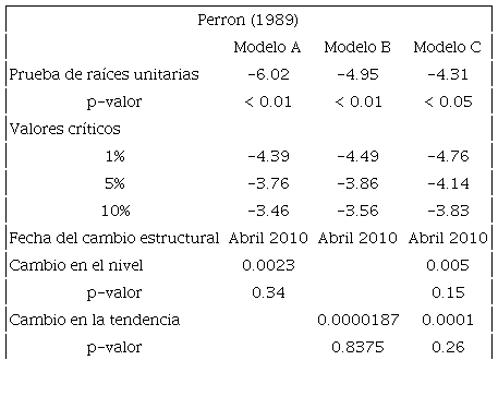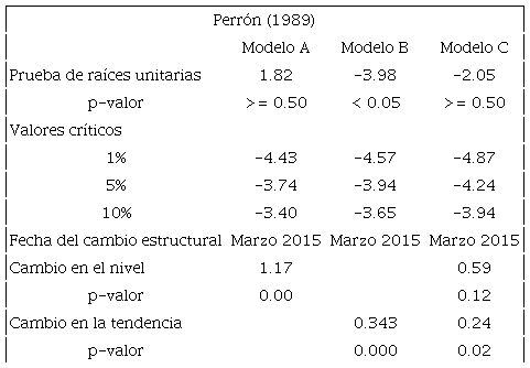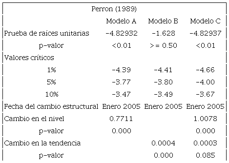 donde interviene una variable dummy para un cambio estructural exógeno en un periodo específico (TB), D(TB)=1 si t=(TB)+1, cero de otra forma. de igual forma es una variable dummy para el cambio en el nivel, si t > (TB), cero de otra forma. La variable dummy muestra si hay un cambio en la pendiente de la tendencia determinística, DT=t-(TB) si t > (TB), cero de otra forma. μ representa el intercepto, β es el coeficiente de la tendencia t, j corresponde a los rezagos y al error. El parámetro k especifica el número de regresores agregados y se utiliza para eliminar las dependencias temporales de las perturbaciones. La ecuación (2) representa el modelo con cambio en nivel, la ecuación (3) corresponde al modelo que solo contempla cambio estructural en la tendencia, mientras que la ecuación (4) permite ambos efectos. Al igual que la DFA, esta prueba tiene una hipótesis nula de que la serie es no estacionaria, contra la alternativa de tendencia estacionaria y utiliza valores críticos reportados para cada uno de los modelos en el artículo de Perron (1989).