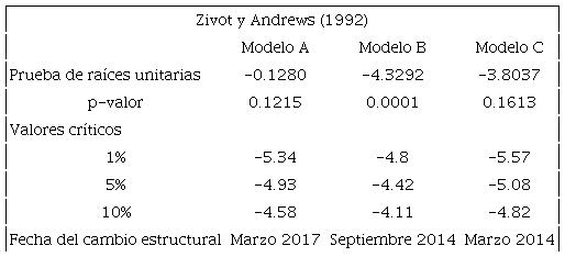 En la prueba de Zivot y Andrews (1992), el resultado del Modelo A permite solo cambios en el nivel de la serie e incluye tendencia determinística, el Modelo B permite cambios en la tendencia e incluye el intercepto, y el Modelo C permite cambios estructurales tanto en la tendencia como en nivel. En los cuadros de esta prueba se presenta en la primera fila el resultado de la prueba ZA, seguido de los valores críticos correspondientes a la misma prueba de ZA, la fecha de propuesta de cambio estructural, seguido del p-valor de la prueba.