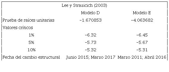 Lee, J. y M. Strazicich. 2003. “Minimum LM unit root test with two structural breaks”, Review of Economics and Statistics, 85(4), 1082-1089.