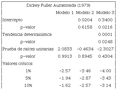 A continuación, se presentarán los resultados de las pruebas de raíces unitarias por cada una de las series incluidas en la investigación. Los cuadros con los resultados de las pruebas se muestran especificando el tipo de modelo. En el caso de la prueba DFA, los resultados sin intercepto y sin tendencia corresponden al Modelo 1, resultados con intercepto al Modelo 2, y resultados con intercepto y tendencia al Modelo 3. De igual forma, las filas tres y cuatro del cuadro muestran los resultados de los coeficientes y los p-valores, siendo que en la tercera fila se muestra el resultado de la prueba con su respectivo p-valor.