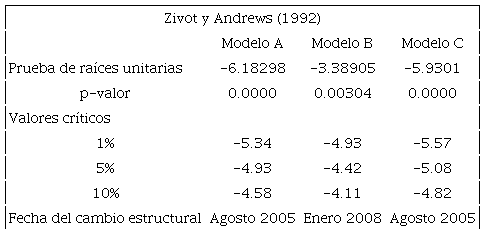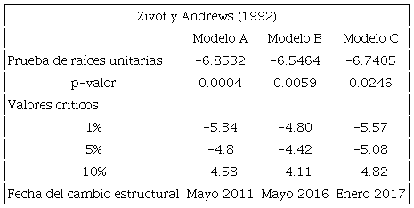 donde =1 si (t > Tλ), cero de otra forma; si (t > Tλ), cero de otra forma; β es el coeficiente de la tendencia determinística t, y λ que representa el punto de interrupción o quiebre bajo la asunción de Perron (1989) de λ=(TB)/T, donde (TB) corresponde al cambio estructural, pero de manera endógena. La ecuación (5) permite un cambio estructural en el nivel, la ecuación (6) en la tendencia y la ecuación (7) es el modelo que permite cambio estructural en el nivel y en la tendencia. En la prueba ZA, se encuentran los valores críticos de la prueba con los cuales se obtiene el estadístico de la distribución para para cada modelo. La prueba selecciona el periodo λ que minimiza el estadístico de la prueba de t para probar que α=1, es decir, la presencia de raíz unitaria.