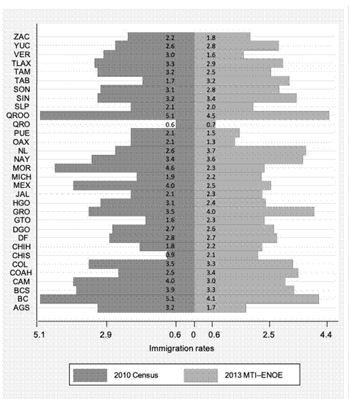 In this paper, we define child labour as a person aged 5 to 17 years participating in any economic activity during the week preceding the interview (Edmonds, 2007). This paper aims to test whether children in new resident households (referred to as immigrants or migrants) have a greater probability of working than children living in nonimmigrant households in Mexico. One disadvantage to measuring migration and child labour effects is the limited information available, particularly about migration. In the present study, immigrant households are defined as those that declare being new residents during the last year. We use the 2013 Child Labour Module (Modulo de Trabajo Infantil, MTI), collected in the fourth quarter, to complement the labour survey of the 2013 National Survey of Occupation and Employment (Encuesta Nacional de Ocupación y Empleo, ENOE). Using these data gives us a better migration measure; the limitation is the outdated data. We inferred migration status from the new residents; we then compared the numbers of migrants per Mexican state with the population census. The resulting comparison provides evidence of a good migration proxy.