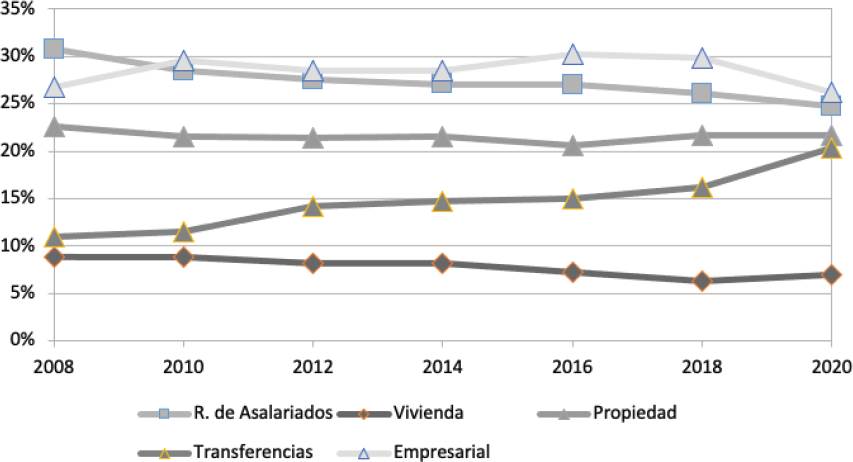Para analizar la distribución del ingreso en los hogares se llevó a cabo una recopilación de la información del Sistema de Cuentas Nacionales (SCN) en el periodo de 2008 a 2020. El SCN sintetiza la actividad de todos los agentes económicos en tres cuentas: i) Producción, ii) Distribución y utilización del ingreso, y iii) Acumulación. A partir de estos datos hemos seguido la metodología presentada en 2019 por el Consejo de Evaluación del Desarrollo Social de la Ciudad de México (EVALÚA) para el análisis del ingreso de los hogares. En la misma, se dividen las fuentes de ingreso de éstos en cinco categorías (EVALÚA, 2019):