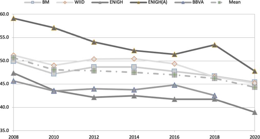 En la Gráfica 2 se expone el índice de Gini acorde con distintas fuentes, así como las estimaciones propias con los datos Sin Ajuste (ENIGH), y con Ajuste mediante el Sistema de Cuentas Nacionales (ENIGH(A)). Las estimaciones apuntan a una tendencia decreciente de la desigualdad durante el periodo de estudio, lo cual se resume en el promedio (Mean).