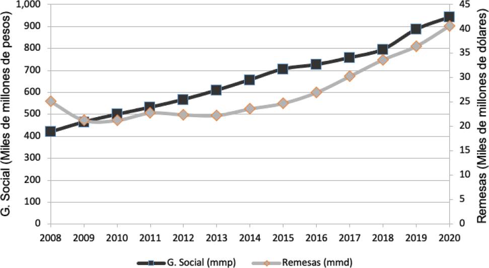 En la Gráfica 1 destaca que el único rubro que ha registrado incrementos sostenidos es el de las transferencias. Este incremento es particularmente notable en los años 2012 y 2020. Es prudente apuntar lo relevante que ha sido en ambos periodos la política social así, como el envío de remesas. En el primer caso, se ha documentado que solamente durante 2020 los recursos destinados a programas de bienestar ascendieron a 25 mil millones de pesos (Márquez, 2020). En el segundo caso, la Secretaría de Hacienda y Crédito Público reveló en su sitio oficial que el monto de recursos enviados por mexicanos en el extranjero durante 2020 sobrepasó los 800 mil millones de pesos, siendo el mayor crecimiento anual en los últimos tres años. Ello manifiesta la indiscutible dependencia de la sobrevivencia de los hogares mexicanos de los programas sociales de transferencia monetaria, y en mayor medida de los flujos migratorios y las remesas que se derivan de estos.