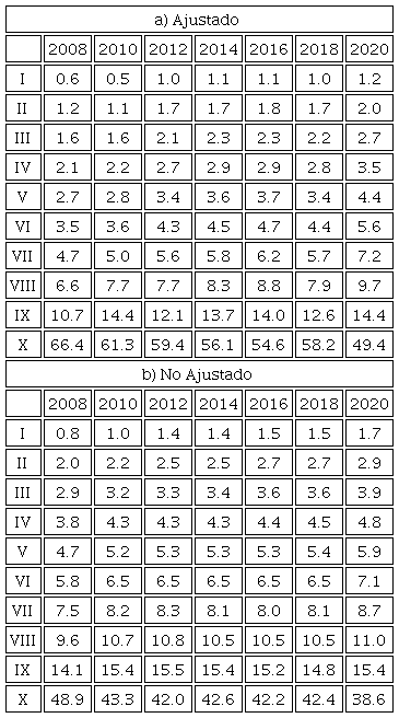 Los datos del Cuadro 1 exhiben dos puntos importantes: 1) durante el periodo 2008-2020, la participación en el ingreso total del decil X es en promedio 15.47% más elevada de lo que indican las cifras sin ajuste; 2) mientras que, en el panel b (sin ajuste), la proporción del decil más alto se estabiliza alrededor de 42% (2012-2020), en caso de realizar el ajuste la participación de dicho decil fluctúa notablemente, llegando a 59.5% en 2018.