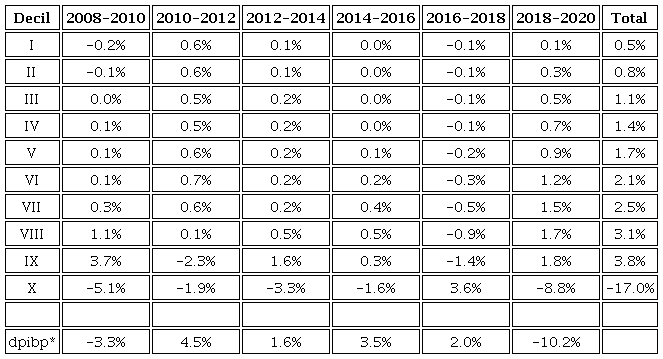 Ya en el periodo de 2012-2014, años en los que vemos la tasa de crecimiento del PIB per cápita modesta, destaca una nueva caída de la participación en el ingreso total del decil más elevado. Por el contrario, en el periodo de 2016-2018 llama la atención que sólo el decil diez tuvo un notable incremento en la participación en detrimento del resto, todos los cuales registraron una caída en su participación.