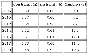 Como cabe esperar, en todos los casos dicho coeficiente es más alto cuando excluimos a las transferencias. Resulta relevante enfatizar que esta diferencia oscila con el tiempo (columna c), y aún más, cabe acentuar que de 2012 a 2014 es tanta la repercusión de las transferencias que son capaces de revertir la tendencia regresiva, pues sin éstas la desigualdad se hubiese intensificado.