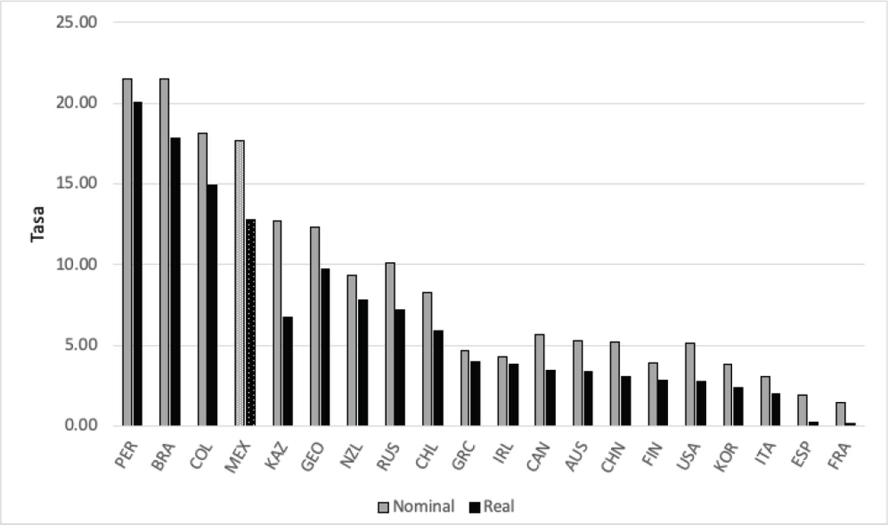 Sin embargo, hay diferencias evidentes al comparar entre países. La Gráfica 1 muestra una selección de 20 países representativos de diferentes regiones del mundo en el año 2018 (OCDE, 2018). Si observamos los países de América Latina, México tuvo una tasa promedio anual (nominal = 17.70%, real = 12.81%) inferior a las tasas promedio de Perú (nominal = 21.55, real = 20.05), Brasil (nominal = 21.50, real = 17.84) y Colombia (nominal = 18.17, real = 14.93), aunque bastante mayor que la de Chile (nominal = 8.30, real = 5.87). Economías más desarrolladas presentan tasas promedio de 5% o menos; por ejemplo, China, (nominal = 5.17, real = 3.10), Estados Unidos (nominal = 5.16, real = 2.72), Corea del Sur (nominal = 3.82, real = 2.35), España (nominal = 1.89, real = 0.22) y Francia (nominal = 1.48, real = 0.18). Hay un conjunto diverso de países con niveles intermedios de tasas, aunque menores a las cobradas en México.