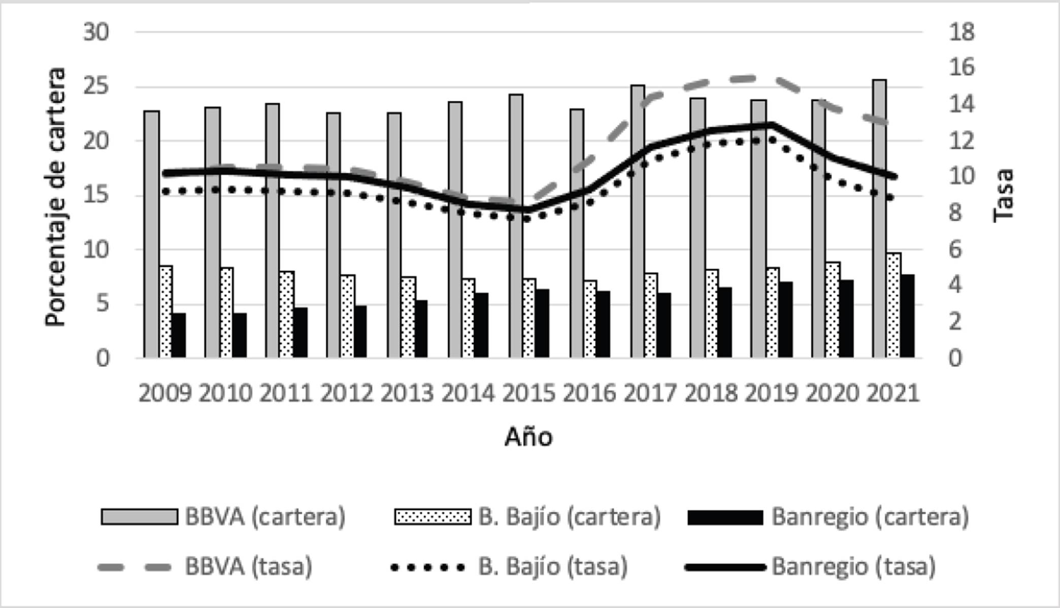 Otra forma de ver la hegemonía de BBVA es su comparación con los bancos medianos más importantes de este mercado, Banco del Bajío y Banregio. Como ya señaló, estos dos últimos bancos aprovechan sus ventajas regionales para poder ser competitivos; sin embargo, tienen que establecer tasas menores que el primero para no erosionar su presencia en el mercado (véase Gráfica 10).
