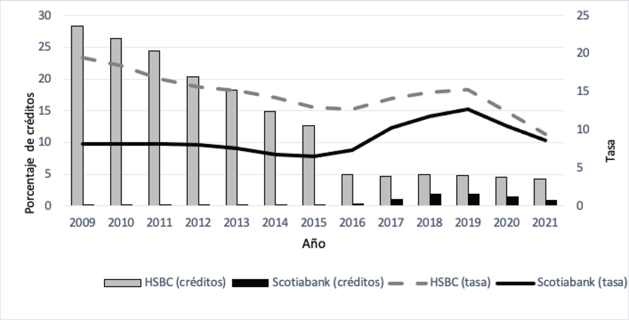 Finalmente, un caso que demuestra muy claramente que el nivel de las tasas en el mercado de las pymes no condiciona la proporción de mercado es el de HSBC. Este banco tenía una participación de cartera entre 5-8% (2009-2013) cuando era el más caro del sistema. Después de 2018 ha fijado tasas menores a las de otros bancos y su participación ha oscilado entre 3-4%. Esta conducta propia de un mercado con poca competencia en precios queda más clara al compararse este mismo banco con el que ha fijado la tasa más baja del sistema, Scotiabank. La Gráfica 11 muestra la comparación HSBC-Scotiabank, donde este último banco ha mantenido porcentajes de cartera muy pequeños, y ni siquiera ha alcanzado al primero, a pesar de ofrecer tasas de interés mucho menores, en algunos años por mitad o menos (2009-2011). Estas conductas son una evidencia de que las pymes que buscan crédito, por alguna razón, no tienen un panorama completo del espectro de tasas de todo el mercado. Muchas pymes, sobre todo las micro y pequeñas, hacen búsquedas limitadas para la obtención de créditos y en diversos casos se basan en recomendaciones de terceros o la gestión de algún intermediario.