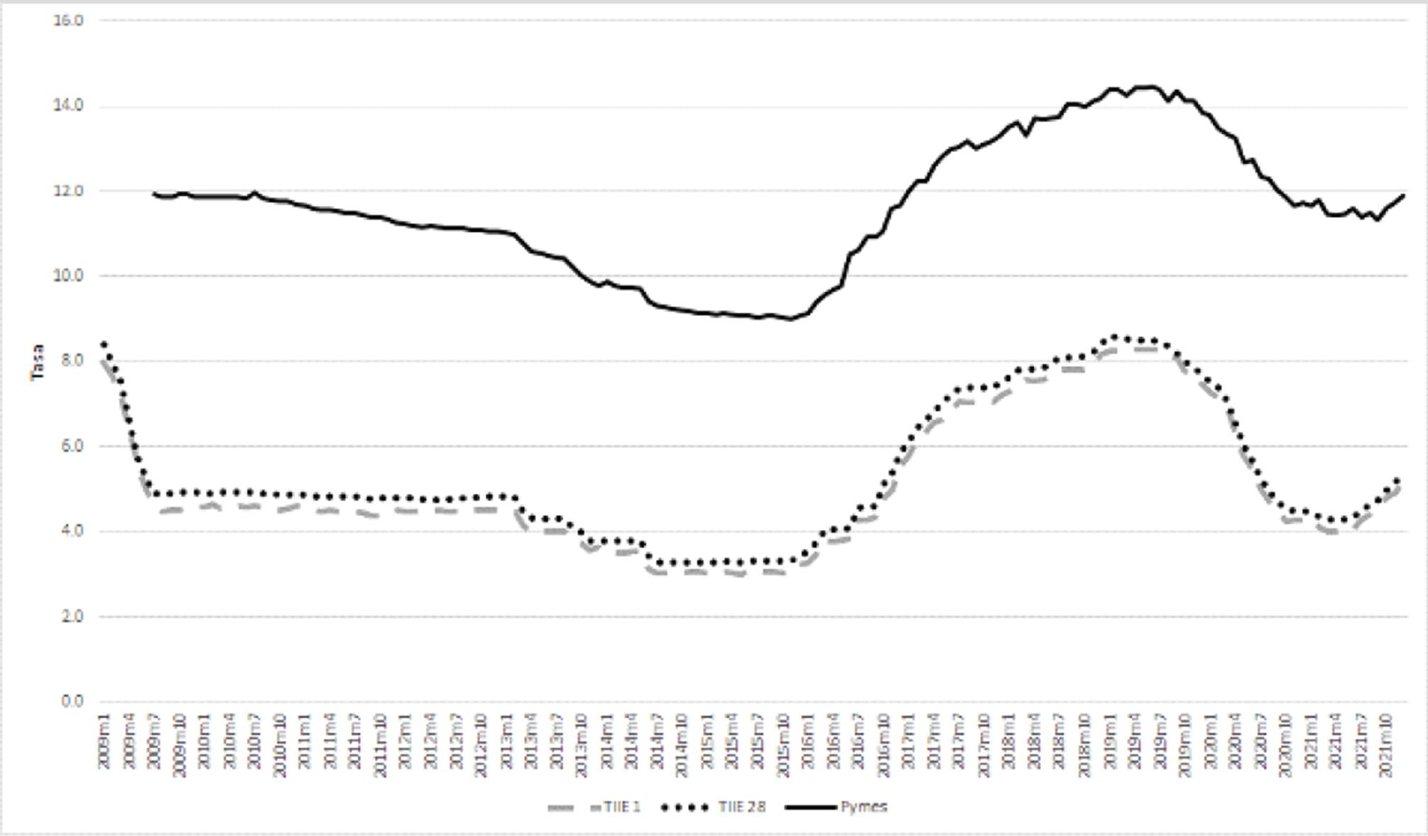 Según se mencionó en la sección 2, mediante el mecanismo de la tasa de fondeo bancario, el Banco de México inyecta o retira diariamente la liquidez faltante o sobrante del sistema bancario, proveyendo de incentivos para que las operaciones de fondeo entre los bancos se lleven a cabo a tasas próximas a la tasa objetivo (Banco de México, s.f.). Las operaciones de fondeo entre los bancos conducen precisamente a la TIIE 28 días y, cabe resaltar que es una práctica común en la banca comercial mexicana establecer los precios de los créditos a partir de la regla de sumar a la TIIE 28 días un número de puntos adicionales. Esta es la razón por la que, en teoría, las tasas de interés bancarias (llamadas también tasas activas) deben seguir una misma trayectoria de largo plazo que las tasas de interés de referencia. Los puntos adicionales sumados por los bancos a las tasas de referencia reflejan su correspondiente valoración de los riesgos u otros costos adicionales que representa cada crédito. La Gráfica 2 muestra las trayectorias temporales de las tasas de referencia TIIE 1 día y TIIE 28 días, junto con la tasa promedio para las pymes de todo el sistema de banca comercial. Se observa que la tasa representativa para las pymes sigue una trayectoria aparentemente coordinada respecto a las tasas de referencia. Durante todo el periodo 2009-2021 la tasa promedio para las Pymes tuvo una media de 11.58, con una desviación estándar igual a 1.56, y con valores mínimo y máximo de 9.02 y 14.47, respectivamente.