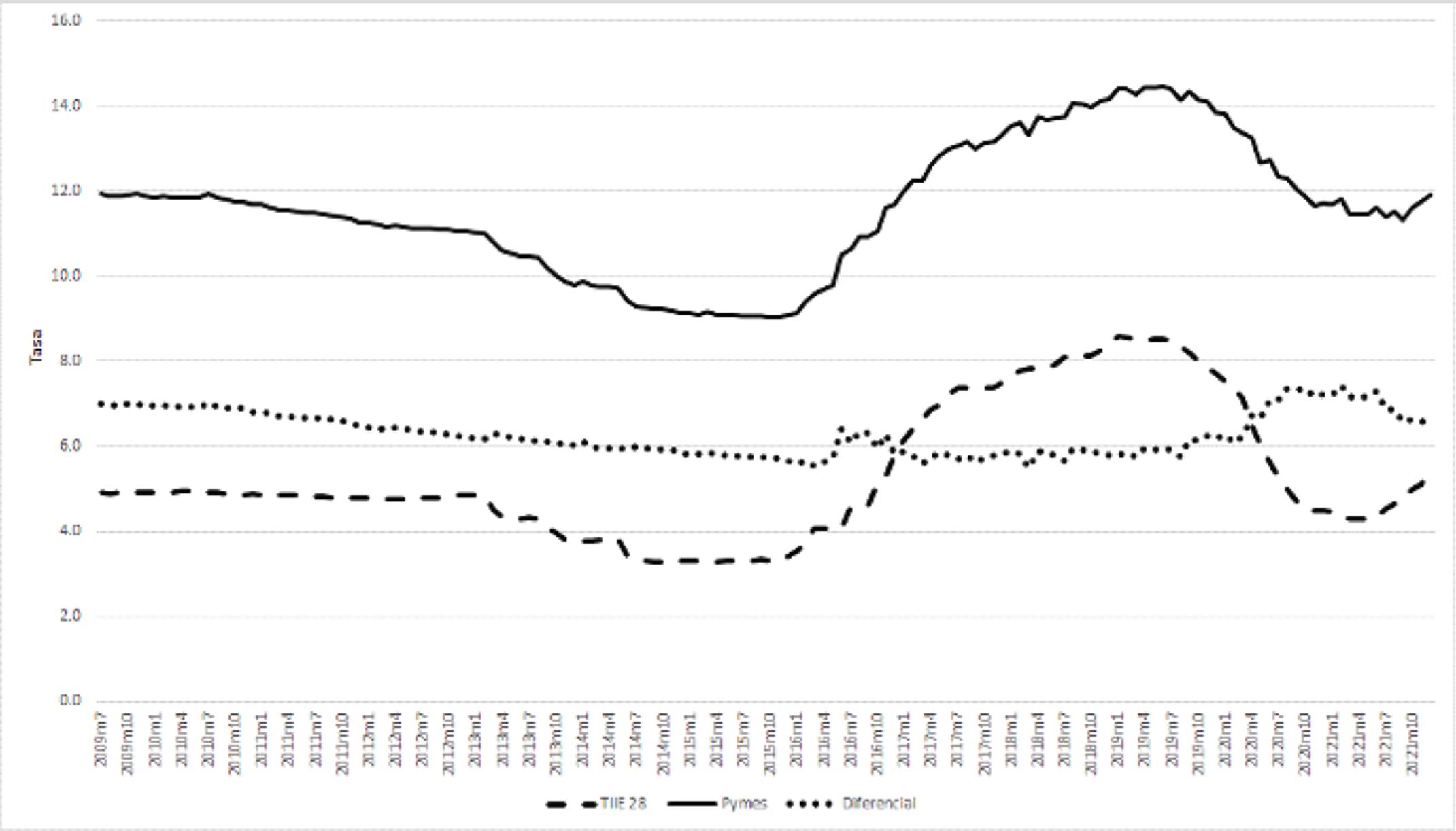 Aunque la lógica diría que es deseable una reducción gradual del nivel de las tasas de interés cobradas a las pymes, está claro que los niveles de las tasas bancarias tienen como principal condicionante al nivel de las tasas de referencia, que pueden subir o bajar por diversos aspectos internos y externos a la economía mexicana. Los menores costos del crédito bancario deberían sustentarse más bien en una reducción en el diferencial entre las tasas de referencia y las tasas cobradas por los bancos. En el periodo 2009-2021 este diferencial tuvo una media de 6.28 (desviación estándar = 0.50), con un diferencial máximo de 7.43 y un mínimo de 5.48. Esta diferencia fue relativamente estable, entre 6% y 7%, durante casi todo el periodo analizado. Sin embargo, hay diferenciales de bancos individuales que pueden duplicar estos niveles. No hay una tendencia de largo plazo en la reducción de dichos diferenciales, lo cual no es un factor favorable para el estímulo al financiamiento y desarrollo de las pymes mexicanas.