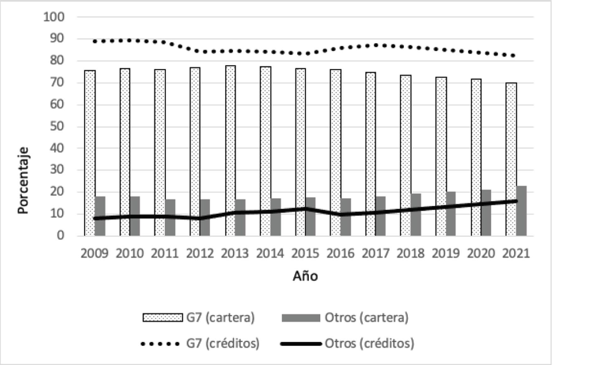 La Gráfica 4 muestra los porcentajes de cartera y número de créditos de la muestra analizada en el periodo 2009-2021, separando por los siete bancos de mayor tamaño del sistema y el resto de los bancos (denominados “otros”). Se puede observar que, aunque los siete bancos grandes han representado más del 80% del número de créditos y más del 70% de la cartera, los otros bancos medianos y chicos han ganado participación de mercado.