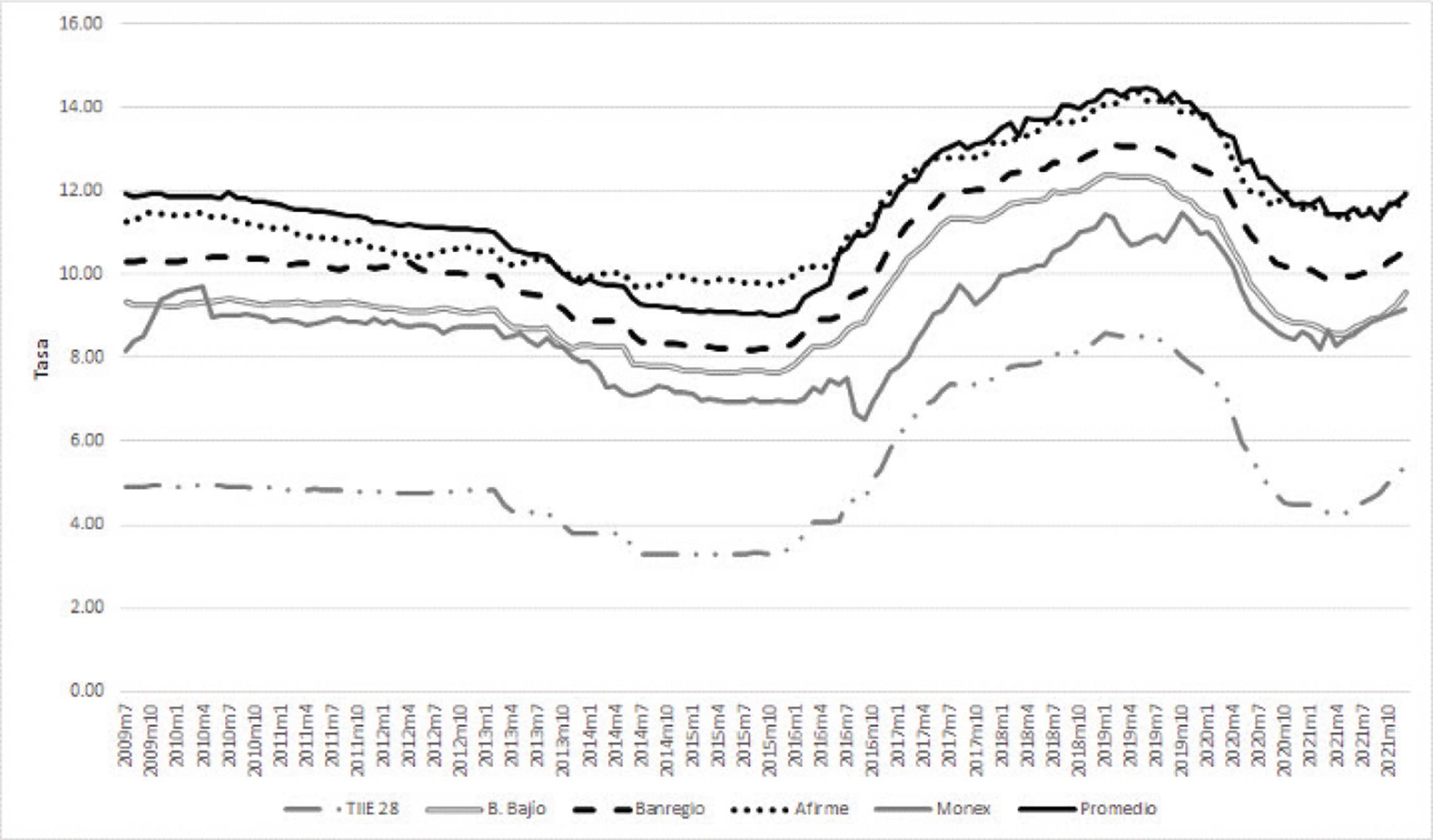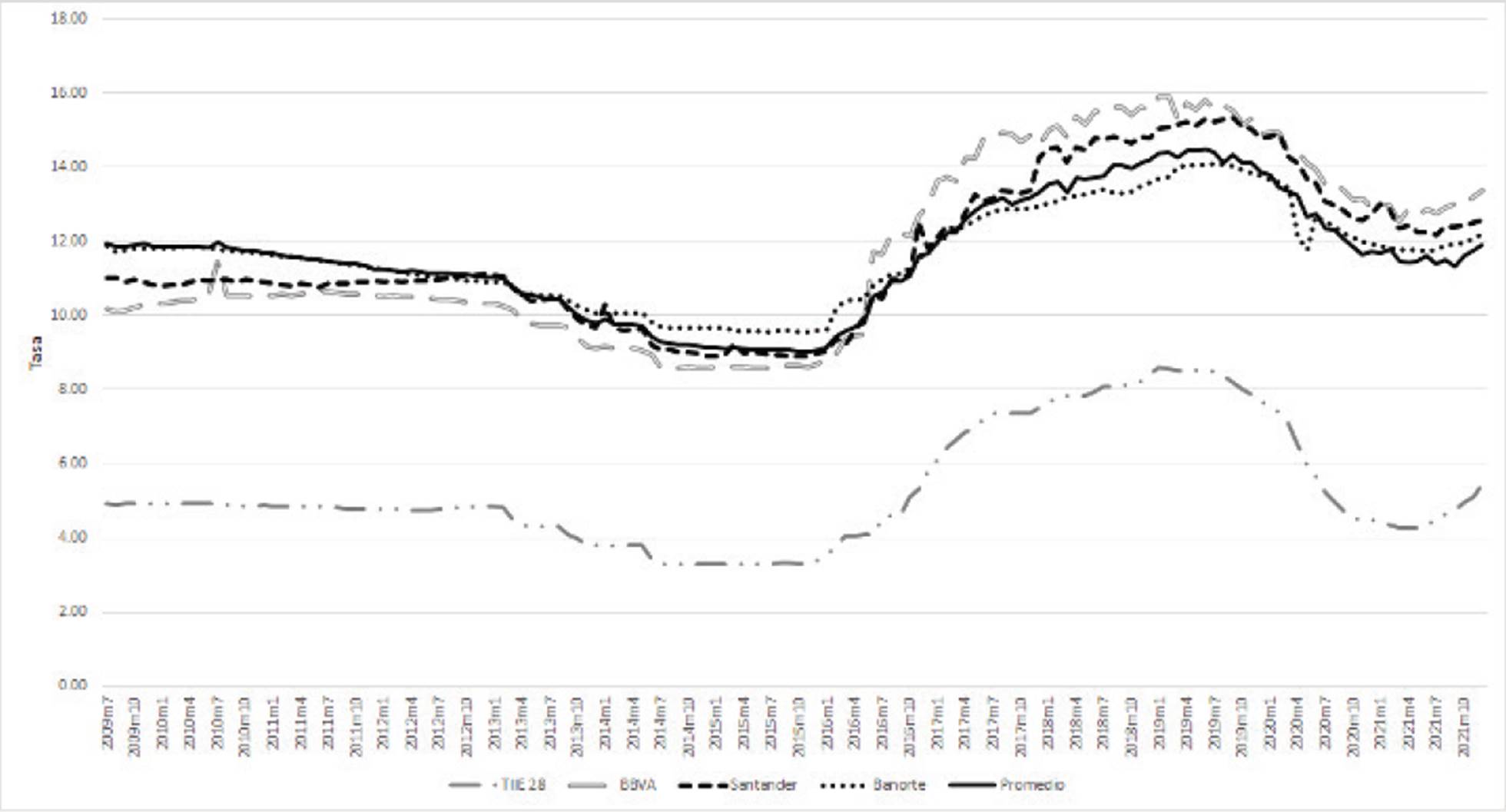 A pesar de la importancia de las tasas de interés bancarias en el desempeño de los negocios que se efectúan en México, hay poco análisis profundo sobre ellas. En la revisión de literatura sobre el tema, sólo se han encontrado dos trabajos que analizan ciertas tendencias de mediano o largo plazo de las tasas cobradas a las pymes, y son los trabajos de Levy-Orlik (2014) y Banco de México (2015). Estos trabajos se enfocan en la tasa promedio del sistema bancario cobrada a las Pymes, pero no analizan la conducta específica de los bancos que componen el sistema. Como se ilustra en las secciones posteriores, la fijación de las tasas a nivel de los bancos individuales tiene ciertas tendencias comunes, pero también conductas heterogéneas.
