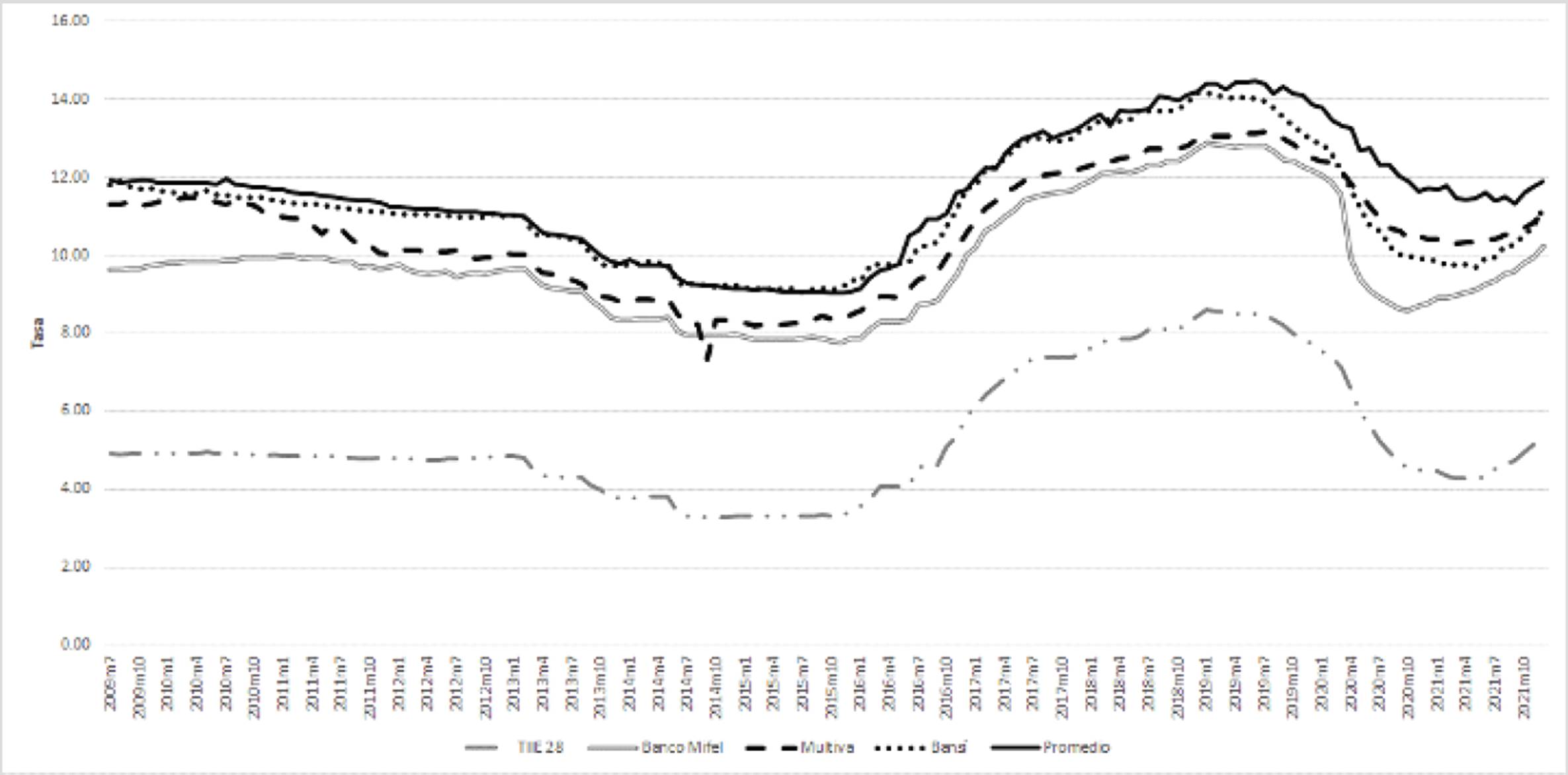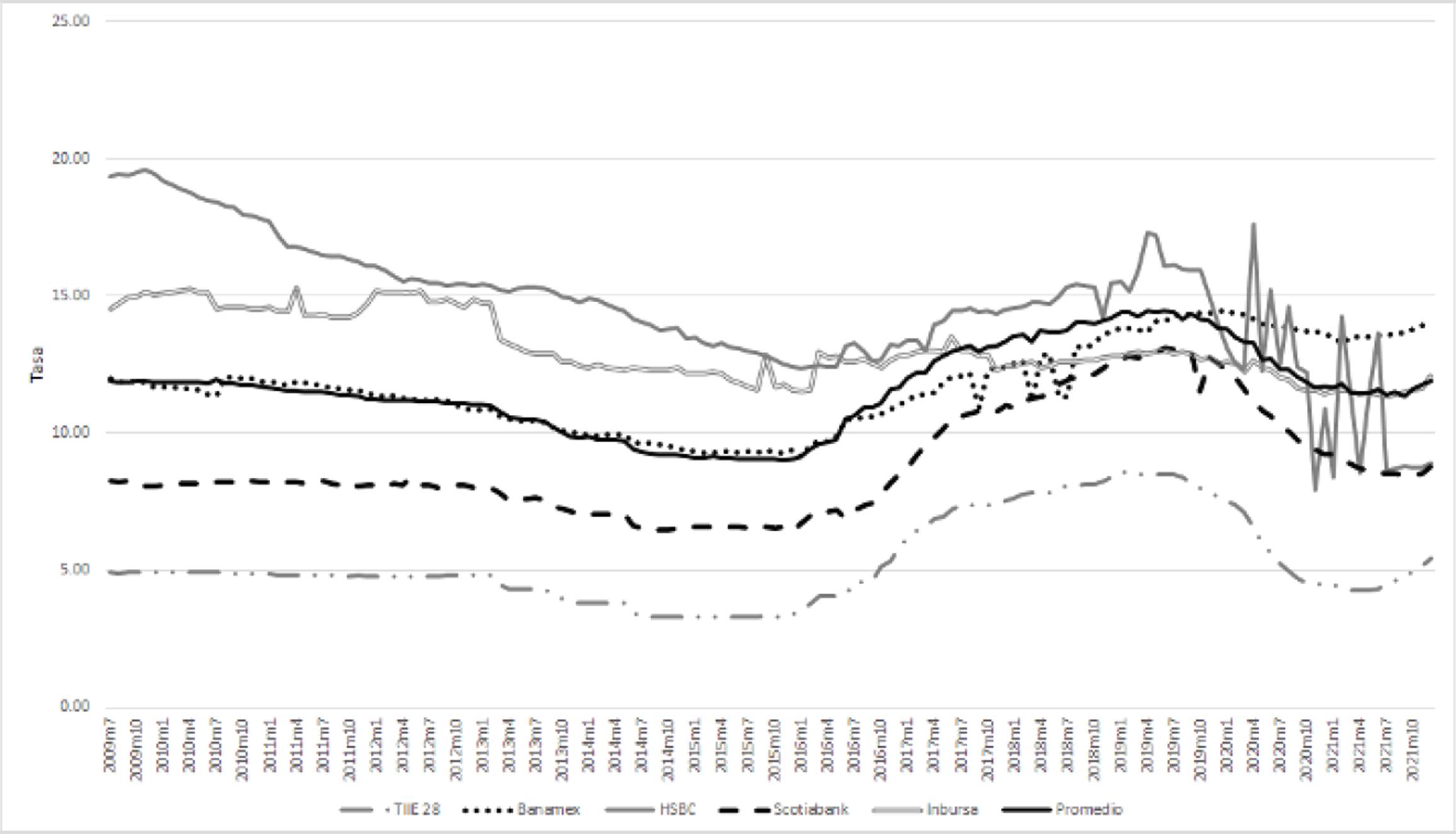 En México, el comportamiento de las tasas de interés bancarias está ligado a las tasas de interés de referencia, que son resultado de la conducción de la política monetaria establecida y ejecutada por el Banco de México. Estas tasas de referencia son la tasa objetivo para las operaciones de fondeo bancario a plazo de un día (TIIE 1 día), y la tasa de interés interbancaria de equilibrio a 28 días (TIIE 28 días).2