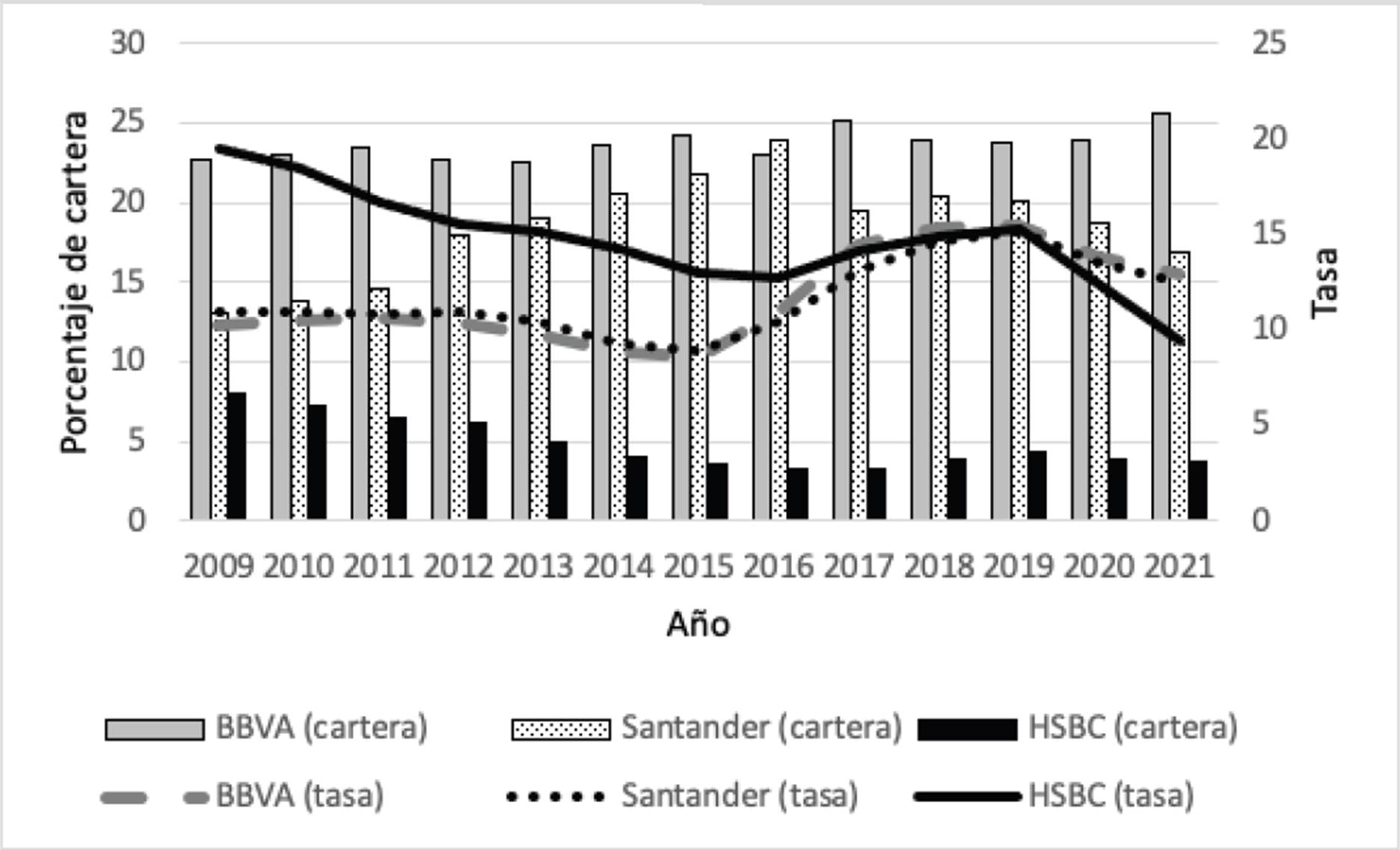 En primer lugar, la Gráfica 9 muestra la comparación entre los dos bancos con mayor participación de mercado en cartera total a pymes (BBVA y Santander) y el banco con mayores niveles de tasas (HSBC) durante gran parte del periodo de estudio. La suma de estos tres bancos representó poco más del 55% de la cartera total (68% del número de créditos) en diciembre de 2021. En primer lugar, cabe resaltar el caso de BBVA el banco con mayor participación en el mercado del crédito a las pymes. Este banco no ha perdido preponderancia a lo largo de los años, sino que la ha incrementado. Como se observó en la Gráfica 5, este banco ha mantenido una tasa por encima del promedio desde el año 2016, lo que sugiere que al mantener su hegemonía ha podido ejercer poder de mercado. Esto es más claro en el periodo 2018-2021, donde ha podido fijar una mayor tasa que sus rivales y aun así les ha ganado participación de mercado. Santander, al ser el segundo banco en cartera, ha podido hacer lo mismo que BBVA, aunque en menor grado.