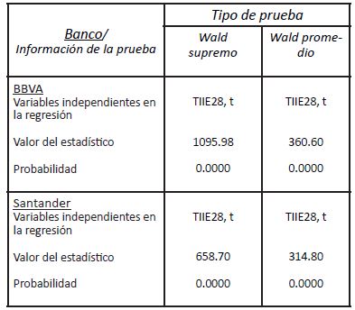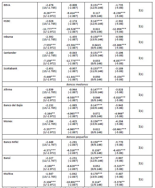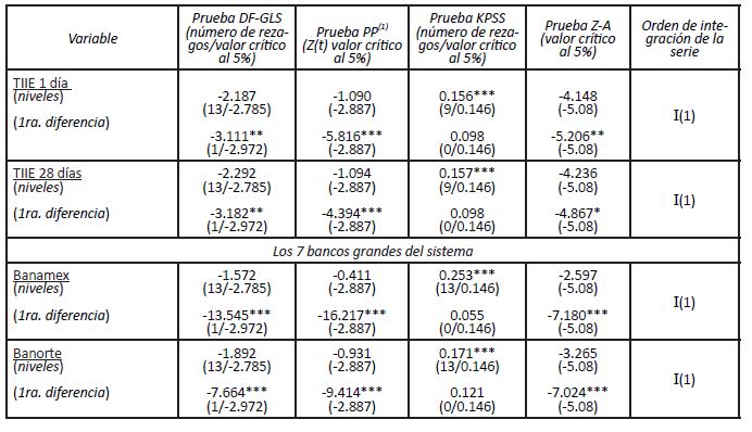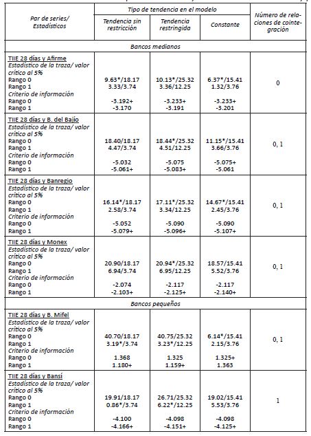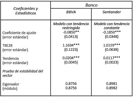 Por su parte, Banorte, el mayor banco de capital mexicano, muestra evidencia débil de cointegración (véanse Cuadro 3 y 4), lo que indica que sigue reglas apegadas a las tasas de referencia, aunque no de forma estricta.