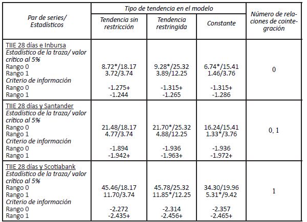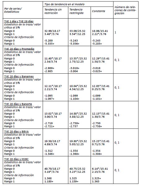 En la sección 5.3 se explicó que un requisito para verificar que las series estadísticas tengan una relación de equilibrio de largo plazo es que sean procesos estocásticos no estacionarios, específicamente procesos integrados de orden 1, I(1). El Cuadro 2 muestra los resultados de las tres pruebas de raíces unitarias que fueron aplicadas a todas las series estudiadas. Como puede observarse en dicho cuadro, tanto las tasas de referencia como las 14 series de bancos seleccionadas, todas ellas resultaron ser procesos I(1), incluso considerando un rompimiento estructural endógeno. Cabe señalar que otro resultado de las pruebas mostrado en el Cuadro 2 es que, al transformar las series a su primera diferencia, se confirma que las series se vuelven estacionarias. Por esta razón, el siguiente paso natural es verificar si existen relaciones de largo plazo entre la tasa de referencia TIIE 28 días y las tasas fijadas por los bancos.