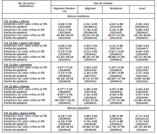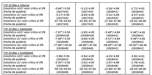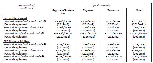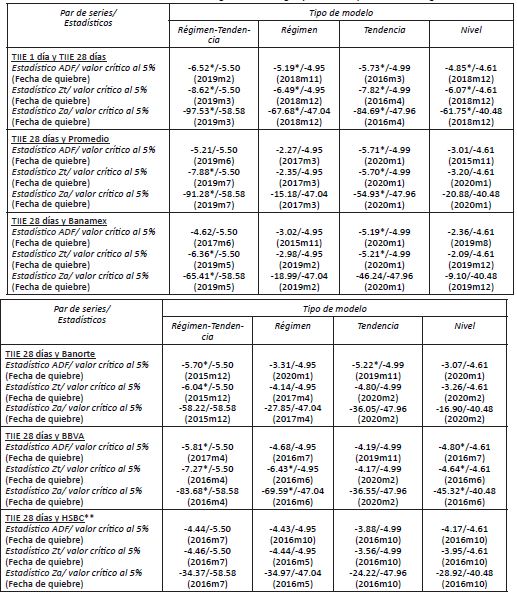 Se aplicaron las siguientes variantes del modelo: a) rompimiento en el término constante, b) rompimiento en constante y tendencia, c) rompimiento en constante y pendiente, y d) rompimiento en constante, pendiente y tendencia. La hipótesis nula de estas pruebas es que no hay cointegración.