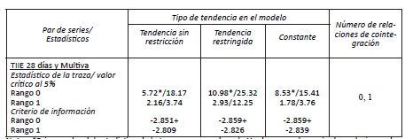 La hipótesis nula es que no hay más que r relaciones cointegrantes contra la alternativa de que hay más de r relaciones cointegrantes. El modelo se estimó con las siguientes variantes: a) tendencia irrestricta, b) tendencia restringida, y c) tendencia constante.