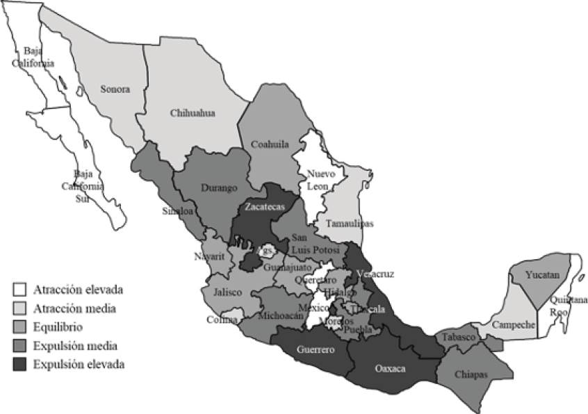 Según el Censo de Población y Vivienda 2020, los estados de Baja California, Baja California Sur, Nuevo León, Querétaro, Estado de México y Quintana Roo presentan las mayores tasas de atracción migratoria, debido quizá a su importante desarrollo industrial y turístico. Por otro lado, los estados de Guerrero, Zacatecas, Oaxaca, Veracruz y la Ciudad de México presentan las mayores tasas de expulsión de migrantes (Gráfica 1). La ciudad de México, que durante prácticamente todo el siglo XX fue el punto más importante de recepción de migrantes en el país, es ahora el estado con mayor expulsión de migrantes.
