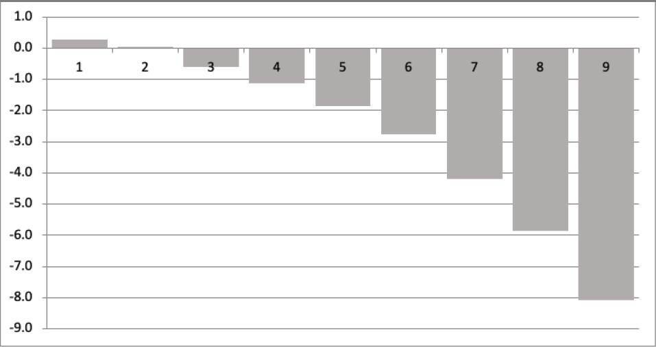 Todos los valores de la columna “cantidades” del TaCuadro bla 5 son negativos, y van disminuyendo, en términos absolutos, al avanzar por los niveles de ingreso. Es decir, si los migrantes tuvieran las mismas características observables que los no migrantes ganarían en promedio entre 11.29% (decil 1) y 6.27% (decil 9) menos que los no migrantes.