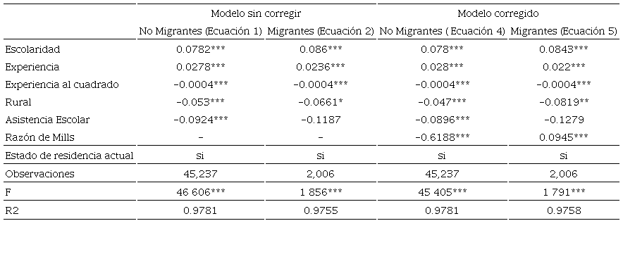 Corrigiendo el sesgo por autoselección se encuentra que, de las -0.055 unidades logarítmicas de diferencia salarial entre trabajadores no migrantes y migrantes, únicamente -0.026 unidades (48%) son explicadas por diferencias en características observables como la experiencia o la escolaridad, mientras que 0.098 unidades (-178%) son explicadas por diferencias en el pago a dichas características observables y -0.127 unidades (130%) son explicadas por la autoselección de los migrantes.