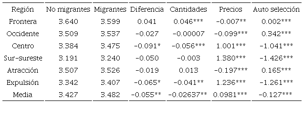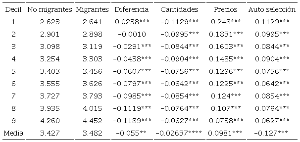 Es decir, si los migrantes tuvieran las mismas características que los no migrantes ganarían en promedio 2.6% menos que los no migrantes (-0.026). O, de acuerdo con la Ecuación (8), si los migrantes y los no migrantes recibieran el mismo pago correspondiente a sus habilidades (tanto aquellas que explican directamente su salario, como aquellas que explican su probabilidad de migrar e indirectamente su salario [sesgo de autoselección]), entonces en promedio los migrantes deberían ganar unidades logarítmicas; es decir, 15.3% más que los no migrantes (3.580-3.427=0.153), ó 9.8% más de lo que actualmente ganan (3.5803.482=0.098). Nótese que éste último valor (0.0981) también puede ser obtenido a partir de la descomposición en precios.