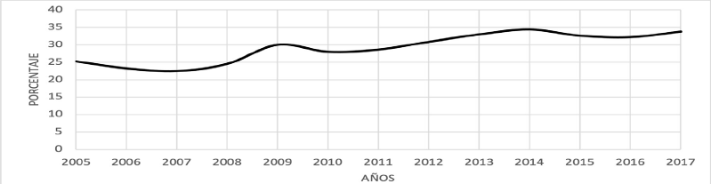 Como ya se mencionó, la proporción de hogares con jefatura femenina ha crecido hasta llegar a representar 25.7% de los hogares para el año 2017. La Gráfica 1 presenta la magnitud de la pobreza en los hogares con jefatura femenina. Se puede apreciar que, durante el periodo observado, la proporción de hogares con jefatura femenina en condición de pobreza se incrementó casi 10 puntos porcentuales; así, para el 2017 alcanzan niveles de 33.8%, situación que resulta preocupante por su magnitud y evolución.