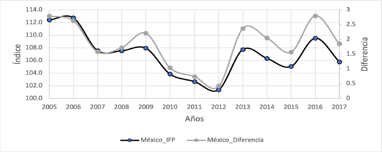 La Gráfica 2 también presenta la diferencia porcentual en los niveles de pobreza laboral por sexo a nivel de hogar. Su magnitud se refleja en el eje vertical secundario (lado derecho). La medida de este indicador de feminización de la pobreza es similar al de Medeiros y Costa (2006). Como se puede apreciar en la gráfica, no hay cambios significativos entre los indicadores; por lo cual, a partir de aquí, se utilizará únicamente el IFP para la medir la feminización de la pobreza.