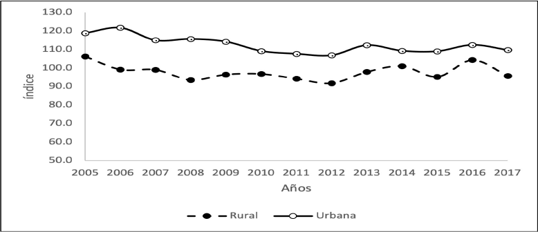 Al respecto, la Gráfica 3 presenta el IFP por tipo de localidad y muestra que la feminización de la pobreza se presenta preferentemente en el área urbana, comportamiento que contrasta con los resultados obtenidos en otros estudios (CIDE, 2011); no obstante, es pertinente señalar que durante el lapso de análisis se observa una tendencia decreciente en las diferencias entre lugares de residencia (rural-urbano) y por género (mujeres-hombres); es decir, existe un proceso de convergencia en la condición de pobreza en los hogares.