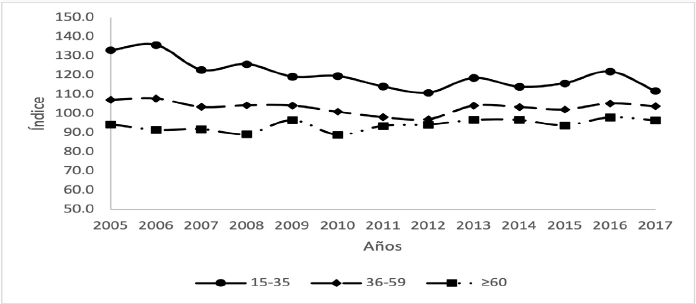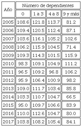 El número de hijos en el hogar con jefatura femenina ha sido uno de los elementos que incide positivamente sobre la condición de pobreza (Castro et al., 2017). El Cuadro 2 presenta el IFP por grupo de dependientes en el hogar, donde se puede apreciar que la sobrerrepresentación de los hogares con jefatura femenina en condición de pobreza no sigue un orden creciente conforme aumenta el número de dependientes en el hogar; en general, el segmento de uno a tres dependientes es el que presenta los mayores índices de feminización de la pobreza. Por otra parte, el IFP tiene una tendencia decreciente en los diferentes grupos.