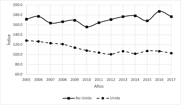 Una de las características más relevantes en el estudio de la pobreza en hogares con jefatura femenina es la condición del estado civil de las mujeres. Diversos estudios encuentran que la condición de “no unida” de la jefa de hogar, incrementa sustancialmente la prevalencia de pobreza en el hogar, lo que lleva a una sobrerrepresentación de este segmento de hogares en la pobreza; al respecto, la Gráfica 5 presenta el IFP considerando el estado civil de las jefas de hogar de los dos referentes geográficos.
