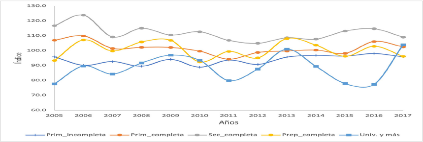 Finalmente, un elemento adicional que se ha explorado para explicar la presencia de hogares en condición de pobreza bajo la jefatura femenina ha sido el nivel educativo, destacando una relación inversa entre sobrerrepresentación de hogares pobres y nivel de instrucción.