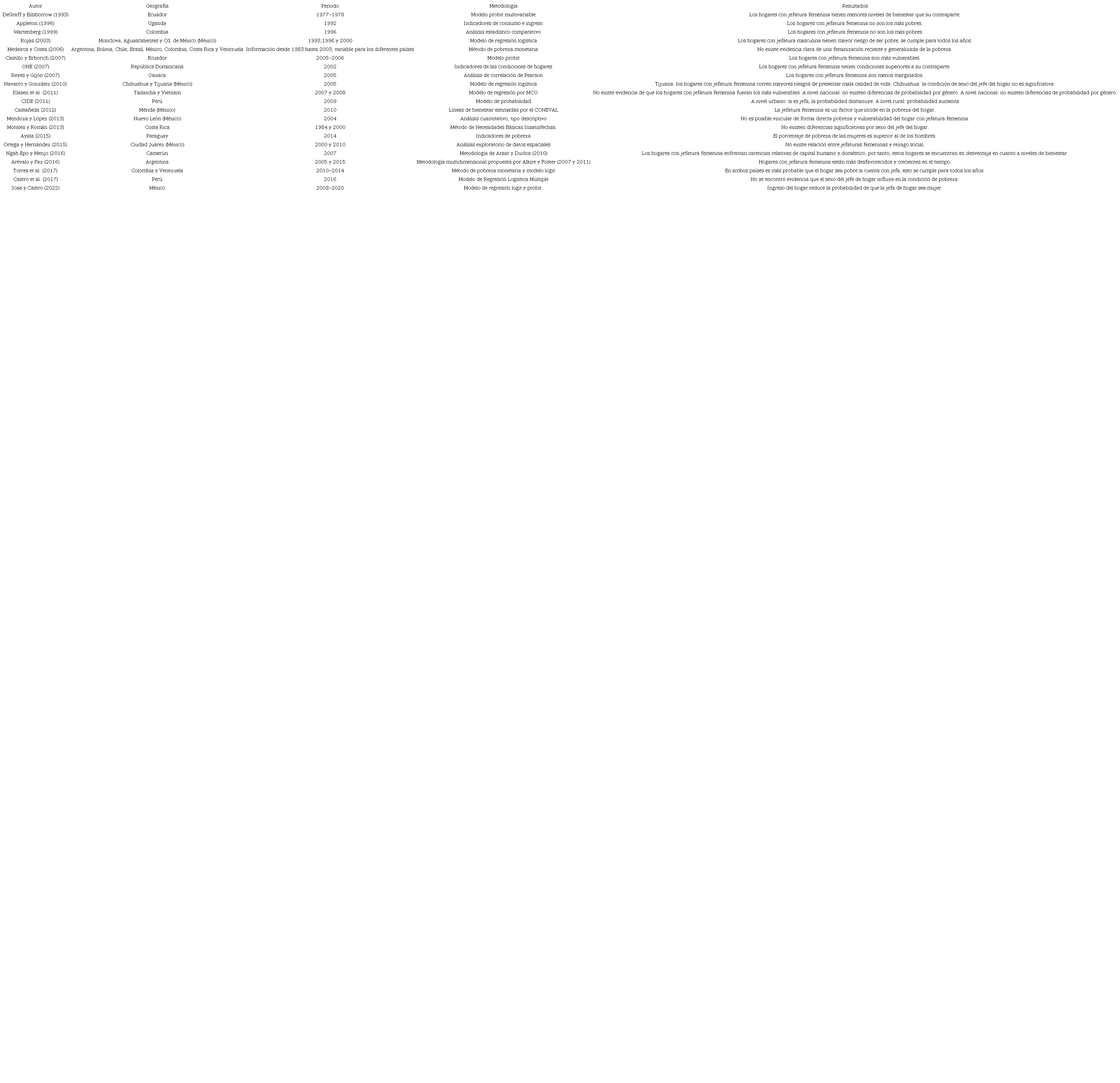 El Cuadro 1 resume los documentos revisados, incluyendo referente geográfico, temporalidad, metodología y principales resultados. A pesar de que el documento de Pearce (1978) señalaba una sobrerrepresentación de pobreza en los hogares con jefatura femenina en los Estados Unidos, se puede concluir que la revisión de estudios empíricos que abordan la característica de jefaturas de hogar femenina como una condición para presentar mayor vulnerabilidad hacia la pobreza con relación a los hogares con jefatura masculina, registra resultados mixtos. Se puede advertir que de la totalidad de los estudios revisados, la mitad encuentra a los hogares con jefatura femenina más vulnerables a la pobreza respecto a su contraparte masculina, (DeGraff y Bilsborrow, 1993; Castillo y Brborich, 2007; CIDE, 2011; Morales y Román, 2013; Torres et al., 2017; Arévalo y Paz, 2016; Ngah Epo y Menjo, 2016; Navarro y González, 2010; Castañeda, 2012; Ayala, 2015; Sosa y Castro, 2022), el resto no encuentra evidencia de ello o sitúa a los hogares con jefas mujeres en mejores condiciones (Appleton, 1996; Wartenberg, 1999; Medeiros y Costa, 2006; ONE, 2007; Klasen et al., 2011; Castro et al., 2017; Rojas, 2003; Reyes y Gijón, 2007; Mendoza y López, 2013; Ortega y Hernández, 2015).