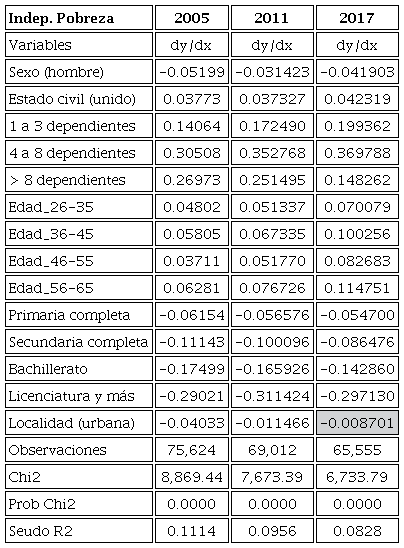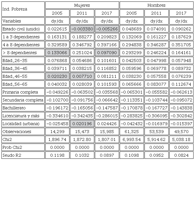 Los resultados del modelo de probabilidad para los años 2005, 2011 y 2017, considerando ambos sexos e incluyendo esta condición como variable explicativa, indican que, si el jefe del hogar es hombre, se reduce la probabilidad de encontrarse en condición de pobreza laboral en relación con que el jefe de hogar sea mujer, aunque la magnitud tiende a reducirse.