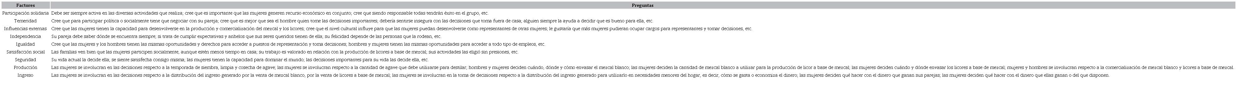 Para la medición del empoderamiento se partió de dos escalas validadas: el Instrumento para Medir el Empoderamiento de la Mujer (IMEM), de Hernández y García (2008), el cual comprende siete factores, y el Índice de Empoderamiento de la Mujer Agrícola (WEIA, por sus siglas en inglés) por Alkire et al. (2012). Este último consiste en cinco ejes temáticos: producción, recurso, ingreso, liderazgo y tiempo, todos valorados con respuesta de tipo Likert de cuatro opciones que se calculan con una suma ponderada; sin embargo, solo dos ejes de esta escala fueron considerados por su pertinencia en el estudio (producción e ingreso) por lo que en dicha adaptación sumaron nueve factores como se muestra en el Cuadro 1.