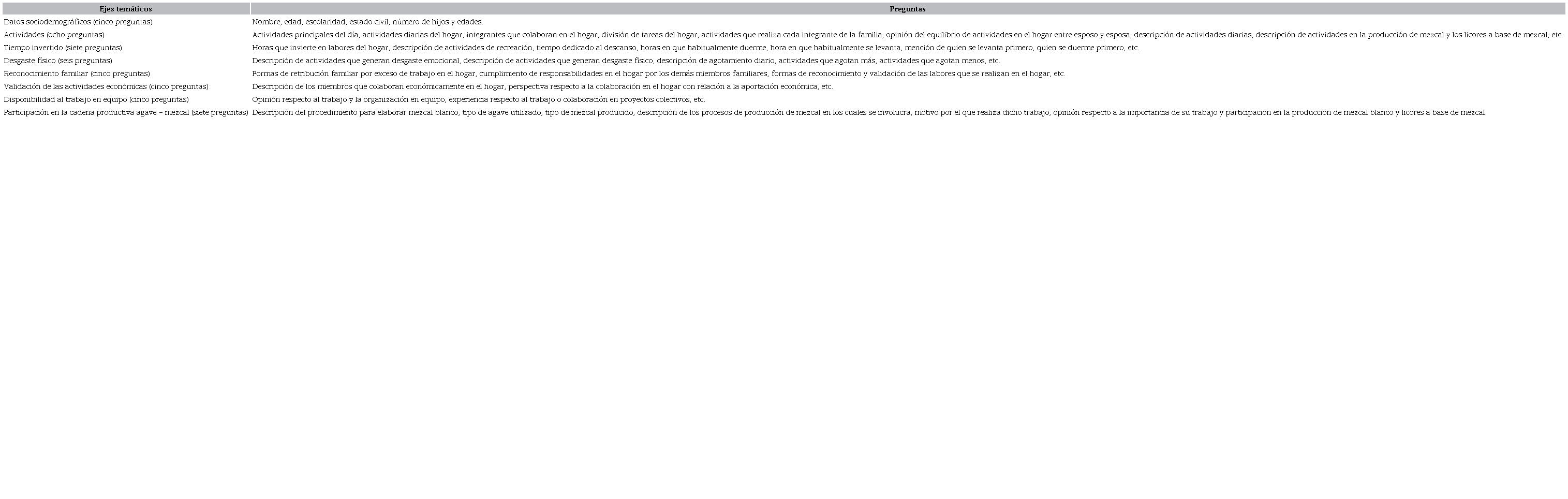 Se diseñó un guion de entrevista y se aplicó en formato de preguntas semiestructuradas (Rusell, 1995), para evaluar la autopercepción de las mujeres y la percepción de sus parejas, con relación a la carga de trabajo que realizan todos los días en el hogar, en los procesos productivos del mezcal y en la elaboración de licores frutales a base de mezcal. Dicho guion estuvo constituido por 48 preguntas distribuidas en ocho ejes temáticos, como se muestra en el Cuadro 2.