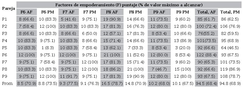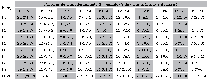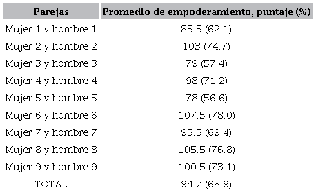 La diferencia entre el promedio total de la autopercepción y percepción fue de 0.5 puntos porcentuales, es decir, las mujeres se perciben con empoderamiento medio y sus parejas las perciben en la misma escala. Asimismo, se promedió el puntaje final de cada pareja a fin de colocarlas en una escala de empoderamiento, como se observa en el Cuadro 5, en donde el puntaje más alto fue de 105.7, equivalente a 78.1%, mientras que el más bajo fue de 78 puntos, igual a 56.8%.