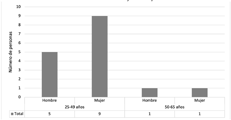 El giro de las empresas fue diverso. Asimismo, se entrevistaron a empresarios de ocho entidades del país. En el Cuadro 4 se aprecia un concentrado de las características generales de la muestra, en el orden en que fueron entrevistados. Se visualiza que nueve mujeres y cinco hombres tienen educación universitaria, un empresario y una empresaria cuentan con formación básica. En la Gráfica 1 se presenta la edad de las y los empresarios. Nueve empresarias y cinco empresarios se encuentran entre los 25 a los 49 años. Dos empresarios (un hombre y una mujer) tienen entre 50 a 65 años.