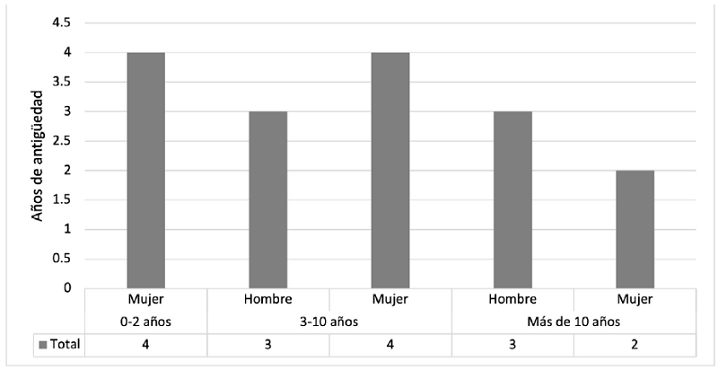 La Gráfica 2 presenta la distribución sobre la antigüedad de las empresas. La mayoría de las empresas analizadas tienen entre tres y 10 años. Mientras que las empresas más jóvenes (cero a dos años) son propiedad de mujeres. Por otro lado, cinco empresas tienen más de 10 años, de las cuales tres de ellas son propiedad de hombres.