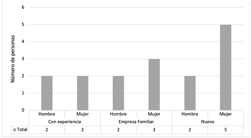 En la Gráfica 4 se observa que cuatro empresarios tienen experiencia, es decir, anteriormente ya habían tenido alguna empresa. Cinco empresarios (dos hombres y tres mujeres) cuentan con empresas familiares y, siete empresarios (dos hombres y cinco mujeres) es la primera empresa que inician.