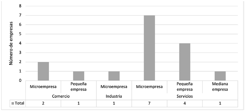 Con referencia al sector y tamaño de la empresa, en la Gráfica 5 se observa que dos empresas son micro y una es pequeña en el sector comercio. Una microempresa se ubica en la industria. En los servicios es donde hay mayor cantidad de empresas para esta investigación, con siete microempresas, cuatro pequeñas y una mediana.