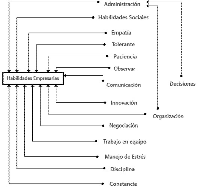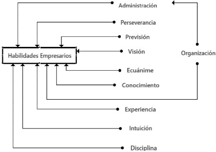 Las divergencias entre las empresarias y los empresarios están presentes tanto en las dimensiones económicas como sociales. Específicamente, en la dimensión económica, se encontraron diferencias en las habilidades que los hombres y las mujeres consideran necesarias para dirigir una empresa. Los empresarios expresan características como el conocimiento de lo que hacen, del mercado, cómo fluctúa la industria, los competidores, la administración, la organización del tiempo y los recursos. En la Gráfica 6 se muestra la red axial que se elaboró con base en las respuestas de los empresarios.