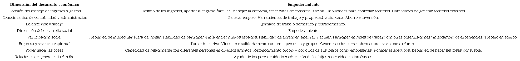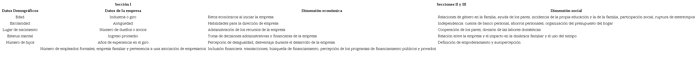 La entrevista se dividió en tres secciones. En la primera parte se preguntan los datos demográficos y de la empresa. En la segunda parte se aborda el empoderamiento económico y se pregunta acerca de la toma de decisiones sobre el manejo de los ingresos, los gastos y la autonomía. En la tercera parte se integra el empoderamiento social, donde se abordan las relaciones de género en la familia, la ayuda de los pares, la incidencia de la propia educación y la de la familia, la participación social, la ruptura de estereotipos, entre otros. En el Cuadro 3 se muestra un concentrado de los rubros de cada sección.