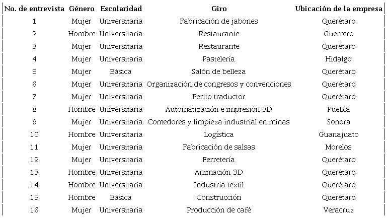 El objeto de estudio es la empresaria o empresario dueños de una mipyme formal. La muestra se integró de 10 mujeres y seis hombres. Previo a la entrevista, se compartió una carta de consentimiento con la información sobre el estudio y se solicitó expresamente permiso para grabar audio. Las entrevistas se realizaron de manera presencial y virtual en los estados de Sonora, Veracruz, Guerrero, Puebla, Hidalgo, Morelos, Guanajuato y Querétaro, con empresas ubicadas en el giro de la industria, el comercio y los servicios.