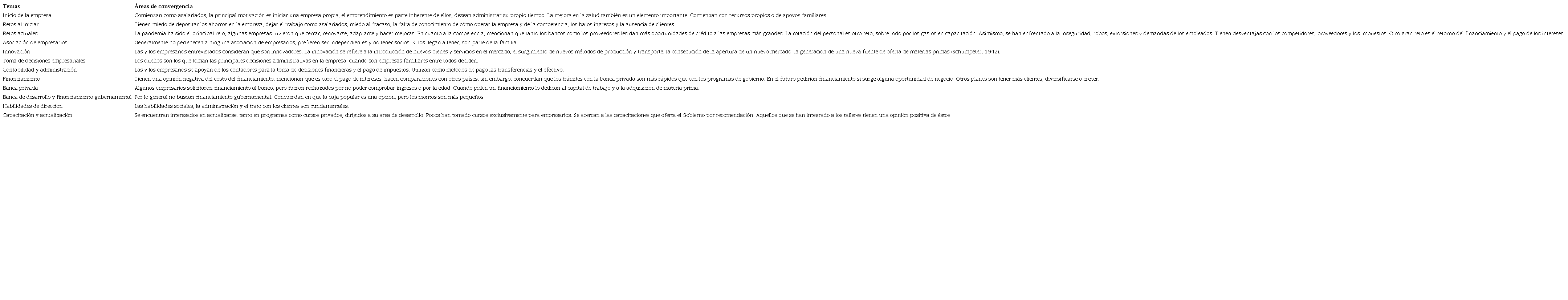 A continuación, en el Cuadro 5 se presentan las áreas de convergencia que se encontraron entre las y los empresarios para la dimensión económica. Los hallazgos coinciden con GEM (2023), en cuanto a que el principal reto al iniciar es el miedo y éste perdura a lo largo de la vida de la empresa. Al principio temen depositar los ahorros que han generado, dejar el trabajo como asalariados, miedo al fracaso y la falta de conocimiento de cómo operar la empresa. Actualmente, la inseguridad en México es un tema con el que han lidiado, así como la rotación de personal y, sobre todo, las consecuencias económicas derivadas de la pandemia.