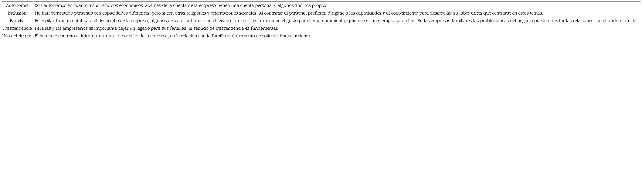 Se encontró que la principal motivación y área de convergencia de la dimensión social entre las y los empresarios es la autodeterminación, es decir, ser dueños de sus propios recursos como el dinero, el tiempo, los medios de producción y la prioridad a la salud. La dimensión económica impacta en la social, cuando expresan implícitamente que la empresa se ha convertido en un medio para el empoderamiento y una forma de trascender, es decir, dejar un legado e influir en la familia, los hijos, el entorno y honrar a los familiares que han fallecido. La familia es un pilar fundamental, funge como la principal red de apoyo, tanto para la empresa como para el hogar. Todos han escuchado del término empoderamiento, sin embargo, tienen duda de su significado, lo consideran una moda. Se observa que la definición no se vincula con lo que expresa la teoría y no se difunde de manera clara en la sociedad.