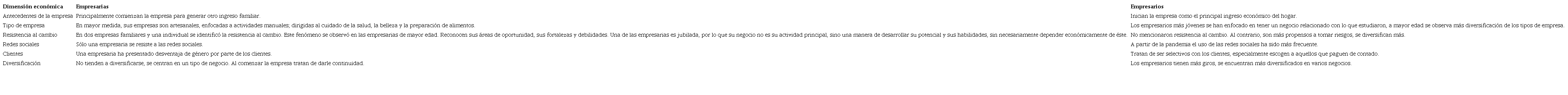 En la dimensión económica, las y los empresarios concuerdan que los principales retos al iniciar la empresa son la falta de recursos económicos y el miedo. La pandemia, el pago de impuestos, la inseguridad y el tiempo representan desafíos actuales. Han tenido que realizar cambios para adaptarse a la crisis derivada de la pandemia, por ejemplo, el uso de redes sociales para vender o darse a conocer. Ser empresario o empresaria les ha permitido generar crecimiento económico. Se consideran innovadores, han integrado nuevas tecnologías en la dinámica empresarial. Sin embargo, las y los empresarios de mayor edad tienen más resistencia al cambio.